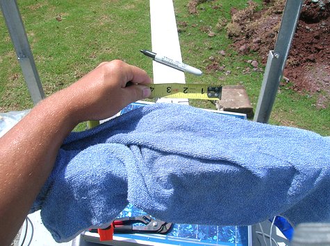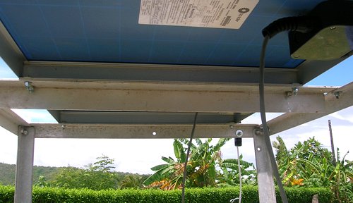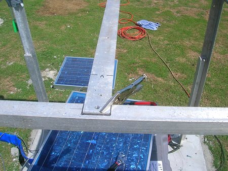 About the only thing left to put together on this last day was the mount for the solar panels. It was a nice, bright, sunny day in paradise. It was so nice and bright and sunny that I had to keep draping my towel over the aluminum framework to keep from getting second-degree burns on my arms. Man it was hot!