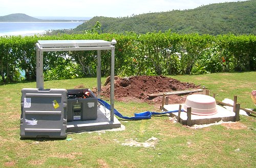 The finished station as I left it. Mark was going to finish up the landscaping, cover the flat hose with dirt, and put some sandbags on top of the vault. If a sensor vault is going to tip as it settles it's probably going to do it the first few months after installation. Ideally you would like to bury the vault under a pile of dirt to keep the temperature as constant as possible, but it's a lot nicer if you don't have to dig it up to re-level it on your first servicing visit. I didn't forget to put the lid on the station box before I left. I just forgot to take a picture of it after I did.