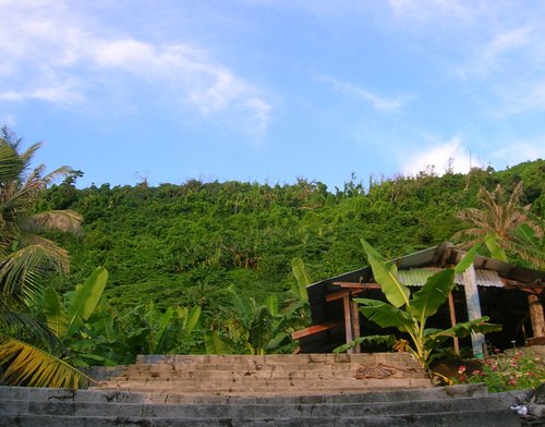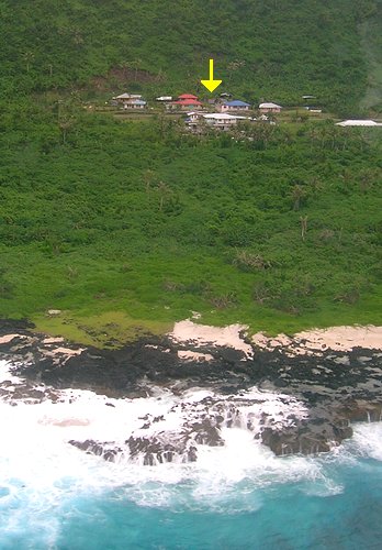 I took the picture below just as we were about to land on Ta'u. The arrow is pointing at the cistern behind Leoso's house where the station was installed. Leoso's house was the one with the blue roof.
