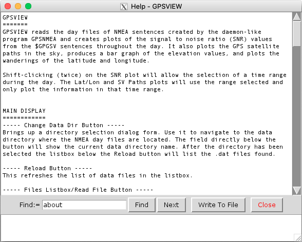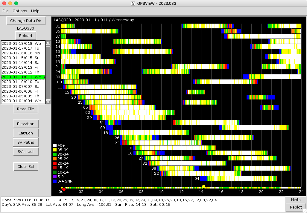 The SV Paths button brings up a plot that shows the path of each satellite throughout the day. Straight up is in the center and the horizon around the edge. From the plot we can see that the SNR improves when the satellites are high in the sky and start to go down towards the horizon. Socorro has a few mountains to the west of town and the plot above shows that with the SNR values staying low when the satellites are about ten to twelve degrees above the horizon.