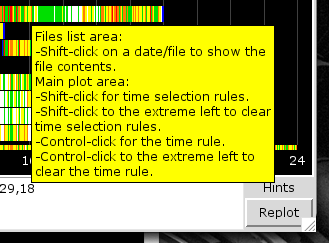 A control-click on the main plot will show a rule indicating the time of the day at that point. The time shown may not be entirely accurate. 86,400 seconds get crammed into a few hundred pixels, so each pixel represents many seconds or even minutes depending on how wide the plot area is stretched.