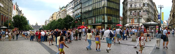 Below is a shot down Václavské Náméstí (Václavské Square) with the Národní Muzeum (National Museum) on the left in the distance. This is near the metro entrances for the Mustek station. I couldn't get the people to stand still while I took the three shots that make up this panorama, so the girl in the yellow shorts shows up in three different places at the same time. This was the usual starting point for several journeys into downtown Praha. Once there you could walk just about everywhere.