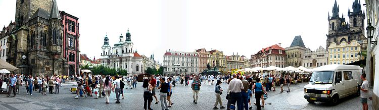Below is a panoramic shot of the Staroměstské Náměstí (Old Town Square) whose usage dates back to before 1400. From left to right there is the large dark building, the Staroměstská Radnice (Old Town Hall) whose construction began in 1338. Next is the Kostel svatého Mikuláše (Church of St. Nicholas) in the Staré Město (Old Town) district. This church should not be confused with the Kostel svatého Mikuláše in the Malá Strana (Little Quarter) district, which you will see on the next page. The dark statue of the Jan Hus Monument is just to the right of center. It was unveiled on 6 July 1915 to commemorate the 500th anniversary of Hus's burning at the stake in 1415 as a heretic by order of the Catholic Church's Council of Constance. Hus preached about the church's corruptness, which, of course, was a no-no. The red-roofed Palác Goltz-Kinskych (Goltz-Kinsky Palace), built in 1755-1765, is next. U kamenného zvonú (House of the Stone Bell) with the dark squarish roof behind the palace dates back to before the end of the 13th century. The two large steeples belong to the Kostel Panny Marie pred Týnem (Church of Our Lady Týn) which is above the parked van. Its beginnings date from the 14th century. The church. Not the van. One of the members of the UTEP group, Ben, is standing to the right of the van. He dates from probably the early 1980's.