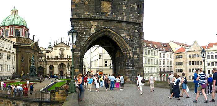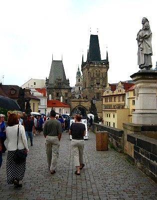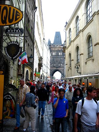 Karlova Nábřeží (Karlova Street), below, leads through the Old Town district from the square towards the Staroměstská Mostecká Věž (Old Town Bridge Tower) of Staré Město, and the east end of Karlův Most (Charles Bridge). Construction of the tower was started in 1380. At this point we were pretending to be salmons by walking upstream. It looks real crowded in the picture, but it really didn't seem that way.