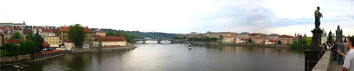 Below we are looking in the downstream direction of the Vltava river from Charles Bridge with Mánesův Most (Mánesův Bridge) in the center, and with the buildings of the districts Josefov and Staré Město to the right.