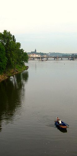 Two bridges upstream from Charles Bridge is the Jiráskův Most (Jiráskův Bridge). Below is a picture taken from that bridge looking downstream towards the Legií Most (Legií Bridge) and Charles Bridge beyond that with Pražský Hrad (Praha Castle) in the background. There are four islands in the Vltava river near the downtown area of Praha. On the left is a portion of Střelecky Ostrov (Střelecky Island). The guy in the boat was trying to impress his girlfriend by paddling upstream.