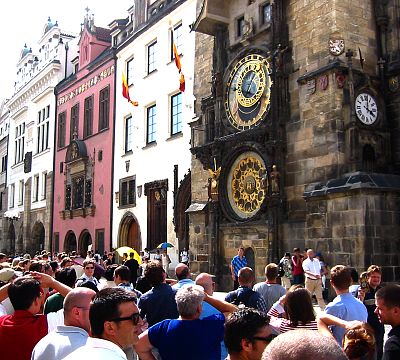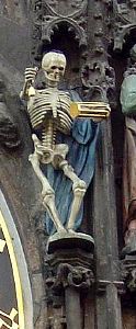 One of the must see attractions is the astronomical clock, or orloj (horologe) in the picture below. It is on the side of the Old Town Hall, and can just be seen at the left end of the panorama above. A crowd gathers every hour to see a small statue of Death (the small picture) at the right edge of the upper circle ring a bell and turn his hourglass over, and to watch the twelve apostles parade by the two windows at the top of the clock. Using a GPS synchronized wristwatch we determined that the clock was exactly one minute slow. I guess we can cut it a little slack seeing as how its construction began in 1410. Everyone cheered and clapped when the twenty second long show was over.