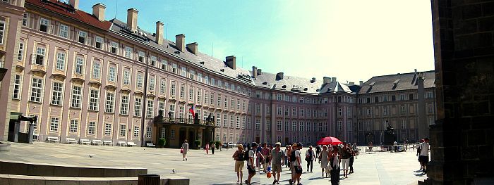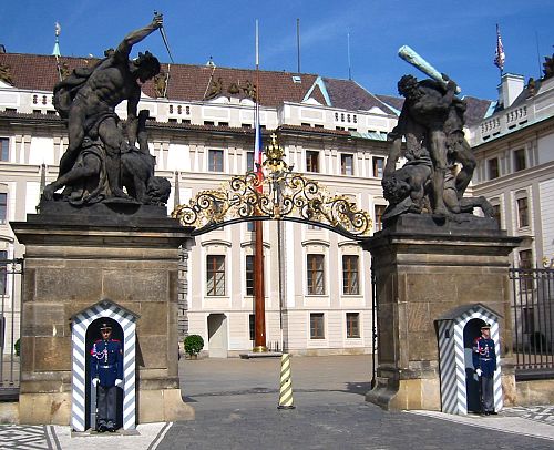 The official entry to the castle grounds (there are many ways to get in) is from the Hradčanské Náměstí (Castle Square) at the west end of the castle grounds. A gateway with statues of fighting giants, called Battling Titans by Ignác Platzer, and built in the the 18th century, leads to the small Grand (or First) Castle Courtyard and Matyášova Brána (Matthias Gate), which is behind the statue on the left.