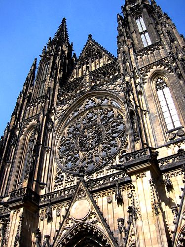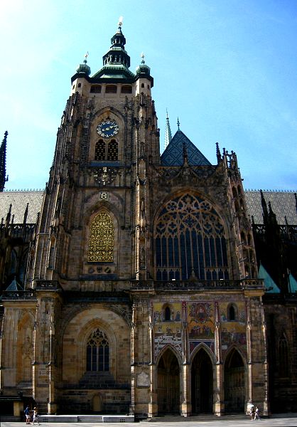 I sat down on the bench next to the building entrance with the flag over it in the picture above and tried to take pictures of the dark building on the right side of the picture above. Below is the result. This is two pictures stitched together vertically of the Great South Tower of St. Vitus's Cathedral. I couldn't get back far enough to get the whole thing in one shot. The stitching didn't go all that well. There is some barrel distortion from the camera's lens, and some things that didn't line up quite right, but you get the idea. It's big. The tower is 96 meters tall. While work on the cathedral began in the 1300's it was actually not consecrated until 1929! You'll notice that there are two clock faces. The upper one indicates the hour, and the lower one the minutes.