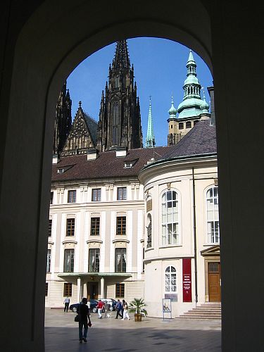 The Matthias Gateway was built in 1614 and leads to the Second Castle Courtyard below. The rounded building on the right is Kaple sv Kříže (Chapel of the Holy Cross) with St. Vitus's Cathedral in the background.