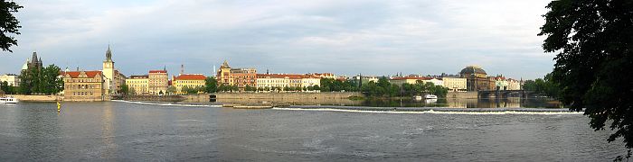 Below is the right (east) bank of the Vltava from the east end of Charles Bridge on the left, south to the National Theater on the right. The Vltava has several small dams across it as it passes through Praha. One is visible in this picture.