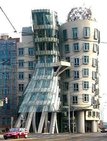 The building below is the Tančící Dům (Dancing House). It was built in the mid-1990s by the American architect Frank Gehry. It fits right in with the rest of the structures...doesn't it?? There was actually some controversy about that when it was built. The building is a little bit further down Masarykovo Street from the buildings in the pictures above, and across the street from the east end of Jiráskův Most (Jiráskův Bridge). It is called the dancing house because shape of the building resembles a couple dancing, especially after you've had a few beers.