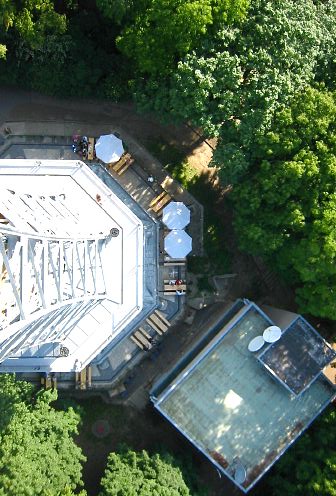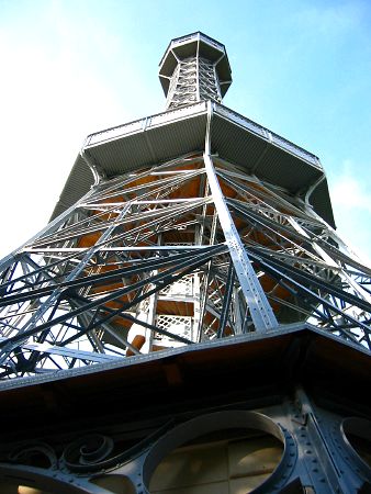 Petřínská Rozhledna (Petřín Observation Tower) sits atop the 318 meter high Petřínské Sady (Petřín Hill) on the west side of the Vltava south of the hill that the Praha Castle is on. It was built for the Praha Industrial Exhibition in 1891 as an imitation of the Eiffel Tower in Paris. It is 60 meters tall, and there is a 299 step double spiral staircase that goes to the top. One staircase is for going up, and the other for coming down. It was meant to just be temporary, but it became so popular that they kept it up.