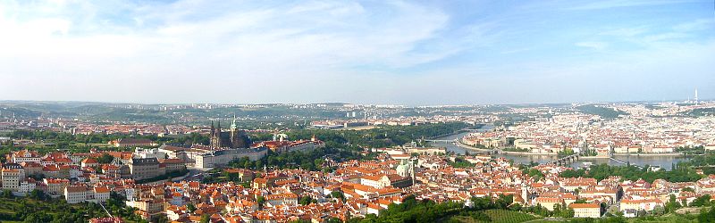 I think the view was worth the climb. Praha Castle is on the left, Church of St. Nicholas near the center of the foreground, and Charles Bridge crossing the Vltava on the right in the panoramic picture below.