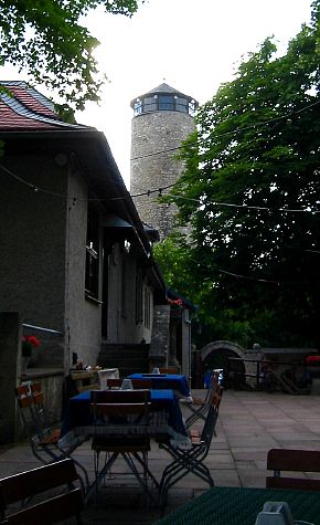 We went for a bite to eat at the Fuchsturm (Fox Tower) near Jena. The Fox Tower is the original keep of the former castle Kirchberg, which was first mentioned in 937. Together with two neighboring castles, Kirchberg was destroyed completely during the war between the Lords of Kirchberg and the cities of Erfurt, Nordhausen and Mühlhausen (possibly in 1304?). The Fuchsturm is the only part of any of the castles that has remained. The first attempts to renovate the tower were made in 1584, but it took until the end of the 19th century before the tower came in use again as a popular lookout tower and even astronomical observatory.