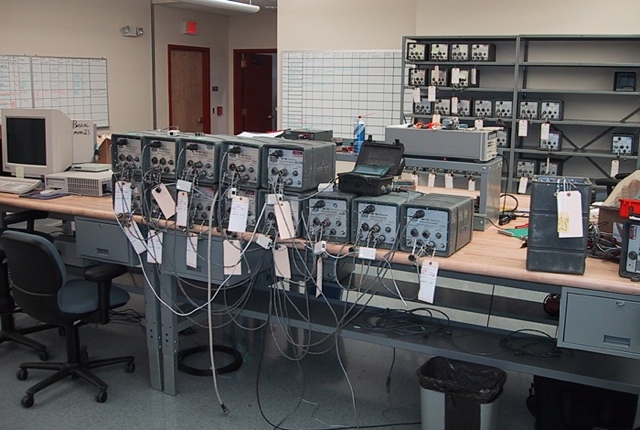 The first thing to do for this type of experiment using this equipment is to conduct a "huddle test". In a huddle test as much of the equipment as possible is set up and programmed just like it will be installed in the field. The equipment is allowed to run for a period of time. The data is then downloaded and analyzed. This shows us if any of the equipment needs to be repaired before it is carried off into the jungle. Most of the time problems found during this test are caused by the equipment being jostled around during shipping; connectors coming loose, printed circuit cards wiggling out of position, etc. During our huddle test only one recording instrument needed minor attention to get it working again.