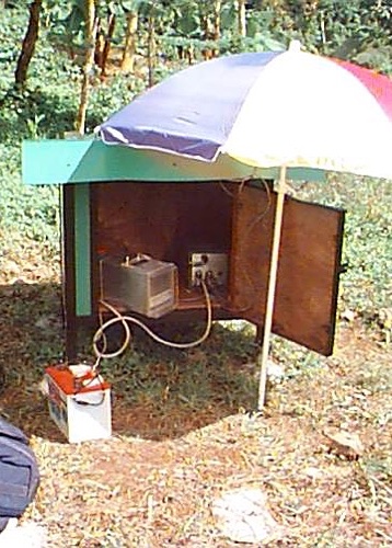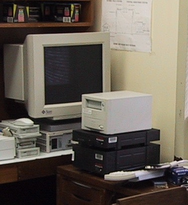 In addition to the field work there is also a lot of work to be performed back at the office. The data must be copied from the FSC portable disks to the Sun workstation. Once there it is massaged and analyzed to make sure the equipment at the stations is operating when you are not standing there next to them. They always wait until you leave have something go wrong. Once that's done the raw data is copied to tape and sent off for scientific analysis back at Lawrence Berkeley Laboratory in California. The Sun Microsystems computer "Topaz", an Ultra 1, was sent to Tiwi to handle the data processing. The disk drives from the FCS fit into that slot on the front of the white box. The tape drive is the thin black box, and the thick one is an external hard disk. The computer is under the large monitor, and three of the removable FCS disks are sitting to the left of the computer.