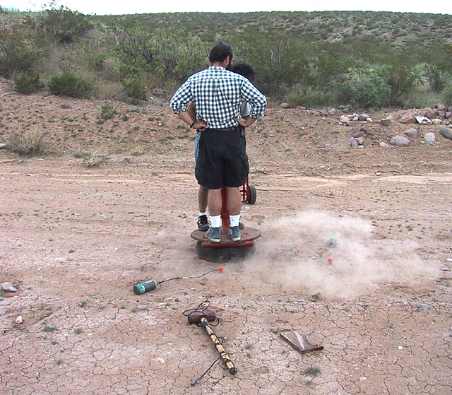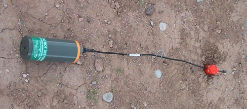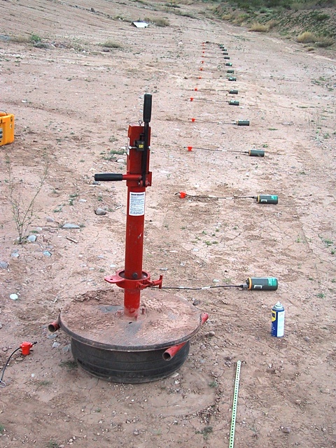 The source of energy for our experiment was a Betsy M3 Seisgun which is basically a shotgun pointing straight down that fires a 8 gauge shotgun slug into the ground. We had two shot windows. At the specified time that the Texans were programmed to start recording we fired the gun once at one end of the line, moved the gun to the other end of the line, and two minutes later fired one shot there when the Texans came on again. Each of the shot windows were only a few seconds long.