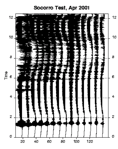 The desired result of these active source experiments is a wiggle plot like the one below. The signal recorded by each Texan is represented by each vertical line. The lines are arranged in order from the Texan that was closest to the source (where the gun was fired) on the left, to the Texan that was farthest away from the source on the right. The wiggles represent the echoes of the shock waves generated by the gun bouncing back from different layers in the ground. In general, the plot is upside down. The further up the plot you go from the bottom of the picture the deeper the feature an echo is coming back from. With a plot like this, and in some cases I suspect after a lot of beer drinking and eye squinting, a scientist can determine what the ground looks like beneath the area being studied. You can see that the 9th Texan, or the sensor connected to it had a problem. Instead of recording a changing signal it just recorded pretty much continuous noise.
