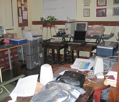 While San Agustin was a great place to vacation, er, work, it was slightly less than ideal for running a room full of electronic equipment. (Served us right.) The electric power was usually 120 volts, but it started to fall off around late afternoon when everyone started turning on lights and televisions. We had all of our computers on uninterruptible power supplies, and they were able to boost the voltage back up to 120 volts and keep things running, but only to a certain point. Once the voltage got down to around 90 volts they would switch to battery power. At that point it was time to shut everything down until about midnight. Once people started going to bed the voltage would come back up enough to where everything could be restarted.