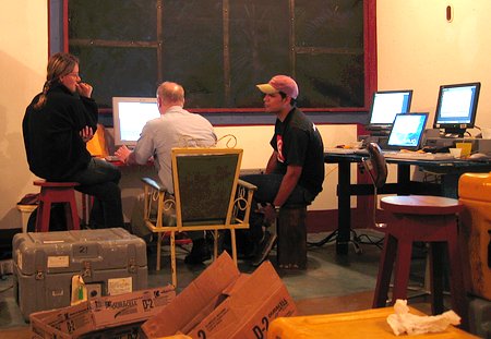 Below is Alan and a couple of students pouring over some of the gathers that were produced from data collected on the previous two deployment lines, while the computers on the right continued to crunch as fast as they could.