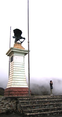 The highway took us to an elevation of 4007 meters (13,146 feet) at Paso Pico El Aguila (Eagle Peak Pass). This is the highest point you can get to by car in Venezuela. Simón Bolívar came this way in 1813 on his Admirable Campaign which ended with his march into Caracas. It must have been a shortcut to have come this way. There is a monument dedicated to him at the pass. It is a statue of a condor holding a plaque with a picture of El Libertador. Below is a picture of the statue and, across the road, the Capilla Virgen De Coromoto. It was a bit of a climb -- at 13,000 feet -- to the chapel, so we decided to visit it next time.