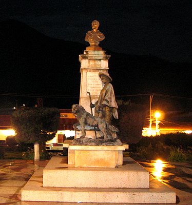 The statue in the Plaza Bolívar , appropriately, was partly dedicated to the Muchuchíes dog. The statue was of a young Indian, Tinjaca, and his dog Nevado, which means Snowy. According to legend Simón Bolívar stayed in the town of Mucuchies and the boy and his dog joined his forces. Both the boy and the dog were shot dead in a fight defending Bolívar. Another story says that the dog awoke Bolívar in his tent two hours before a surprise attack saving Bolívar from being killed. In 1964 the Mucuchies breed was designated as the national dog breed of Venezuela. The breed is used as livestock guard dogs.