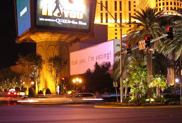 Across the street from the Bellagio fountains in October 2004 was a billboard that didn't quite say what you thought it said. It was an election year.