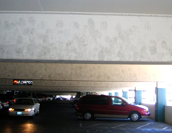 I suppose it all started as one small step for a man, but now there are footprints all over the ceiling trusses in the parking garage. Those crazy tourists.