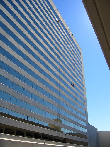 Window cleaners on the side of the hotel. The guys were seated in chairs and were just slopping water all over the place. It didn't look like a terribly efficient process.