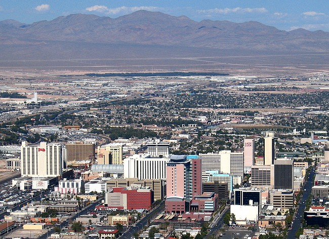 A view of the original casino area of Las Vegas, Glitter Gulch, from the observation level. You can see the display of the Freemont Street Experience stretching between the buildings.