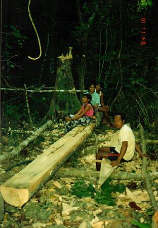 The guy in the picture is Papa Merlin. He was the chief architect and wood cutter in Ngolos. He sawed down the tree and carved (with only hand tools remember) the keel of the boat. His plan was to use the other half of the tree for the keel of a bangka that he was going to build for himself. Unfortunately the tree had a bad spot running down the middle of it, and he could only get one good keel out of it.