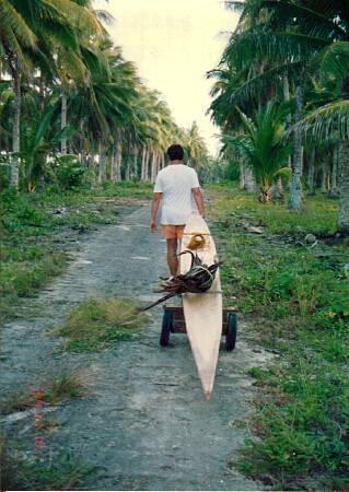 We were on the Sapao Beach side of the island, and Ngolos was on the other side of the jungle, so the keel had to be carried out of the jungle and then rolled to the other side of the island. This was one of the roads near Sapao Beach that was built during the war. It may have even been a taxiway since it ran parallel to the big ruway that was off to the left.
