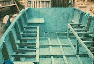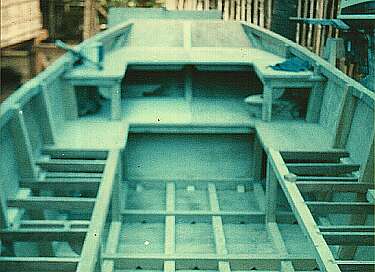 When the hull was finished it was time for some big-time guessing. My "plan" didn't really include any of the interior stuff. So I was winging it. I knew I wanted benches down both sides (just like a real jeepney), and I thought that it would be nice to be able to step up and off the front of the boat in the event I pulled up to the back of one of the yachts -- even though I wasn't too sure about getting too close to a yacht for fear of banging into one. I also knew that I needed a place to sit and pilot the boat from.