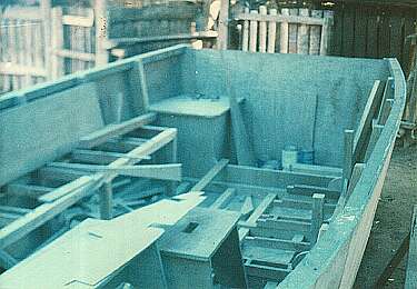 The photograph above shows that plan taking shape. The starboard (right) side bench, and the stepped arrangement in the bow can be seen beneath the rubble.