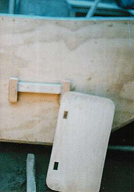 The step on the outside was somewhat (or somehow) inspired. I wanted something that could be taken in when traveling outside the bay, but I didn't want any moving and/or rusting parts. What I came up with is in the photograph below. The two "pegs" mounted on the side of the boat fit into the two square holes in the step. Then the step was suspended from the side of the boat with rope, which you will see later (if you keep reading). Everything was hand carved.