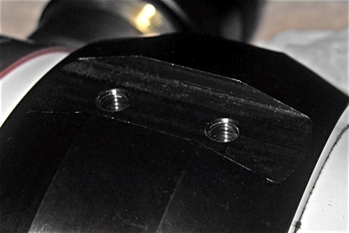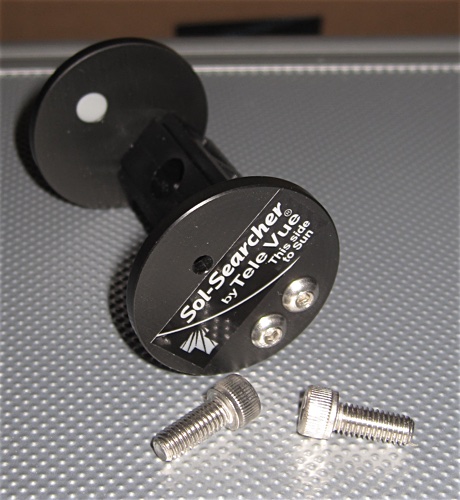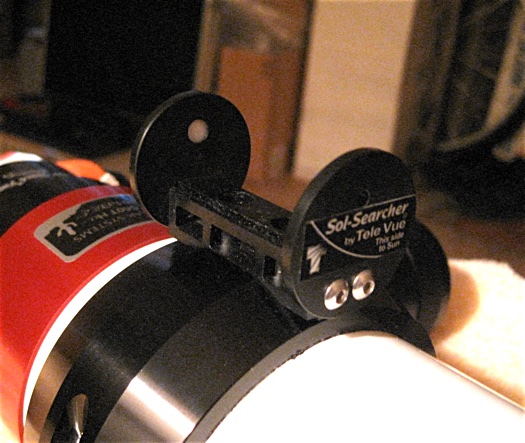 At the top of the clamp ring that goes around the telescope's tube there is a groove and two bolt holes that look like they were made for the Sol-Searcher. Actually, it's probably the other way around. The holes are 3/4" apart, are about 1/4" deep, and are threaded for #10-32 bolts. Just for future reference the groove is just under 5/8", or is close, if not exactly, 16mm in width.