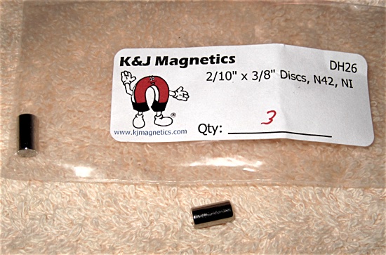 I've used a lot of magnets in woodworking projects the last year. You can get just about anything you want in terms of little magnets from K&J Magnetics in New Jersey. It took a couple of orders, but these 2/10" diameter, 3/8" long Neodynium Rare Earth magnet cylinders ended up being just right.