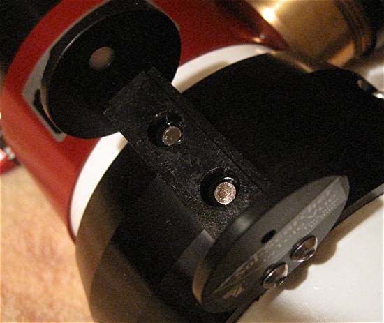 Next I applied a bead of the 'no run gel' version of Krazy Glue to the area of the two magnets as indicated in this NASA simulation picture. I couldn't take a picture of this step, because I was too busy trying to not glue myself to the magnet. After the glue was on I pushed the end nearest the glue down from the top into the bolt holes in the Sol-Searcher. I was trying to get a nice layer of glue between the magnet and the sides of the holes without getting any near the heads of the set screws. It seemed to work OK. I put the finder on the scope and finished pushing the magnets down until they touched the set screws.