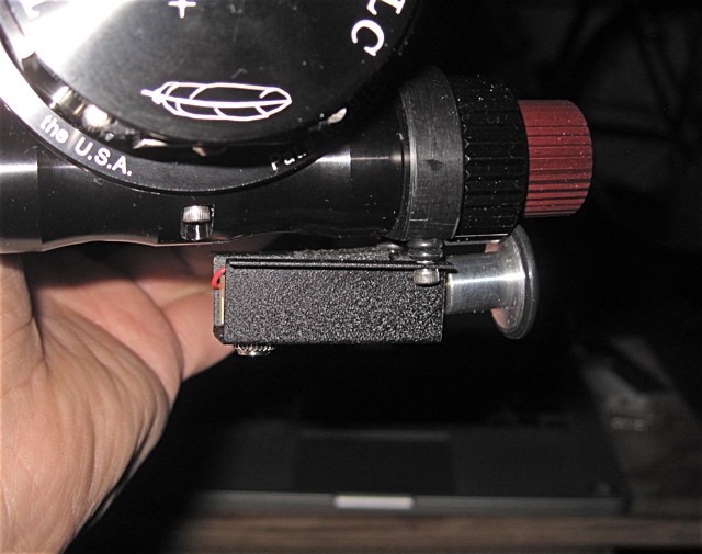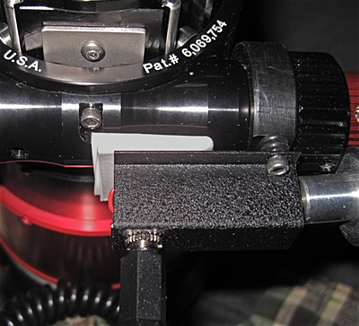 Back to the lumber yard. Good thing the town is only about three miles by three miles in size. This time I bought the same socket cap bolt, but 3/8" long. Too long to be useful? Why would I buy useless bolts? The longer bolts threaded all of the way in to the collar holes, which is a nice secure feeling, and then stuck about 3/16". I used the two supplied tiny O-rings from the original bolts, and the two supplied tiny spare O-rings as spacers between the nylon collar and the motor housing. The kit also comes with two spare 'rubber wheel' O-rings. That's nice. With everything put together the motor just hung under the scope loose with the wheel just resting on the red fine focus knob from the weight of the motor and gearbox, which is approximately nothing. In this state there is no problem spinning the knobs manually. Some amount of pressure was going to have to be supplied to make this work.