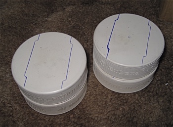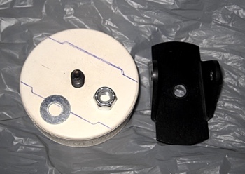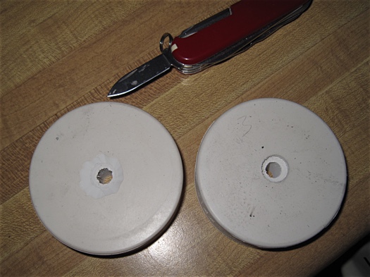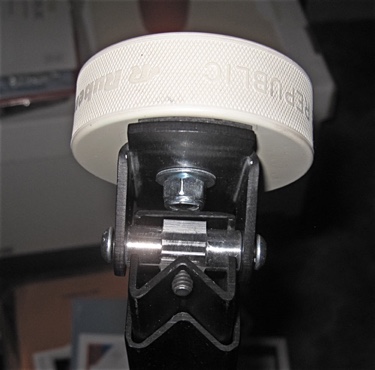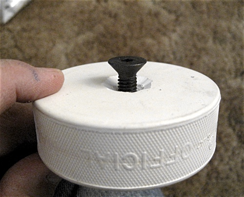 The original plan seemed easy enough. Get three hockey pucks, carve out an area the same size and shape as a foot with something like a Dremel tool, slip the pucks under the feet when setting up and observe happily ever after. I found white hockey pucks! I figured they would show up better in the dark. I have never seen these before. They are for training goalies. We used to train the goalie by beating the crap out of him with the regular black pucks when I was a kid. These pucks would have made that a lot easier.