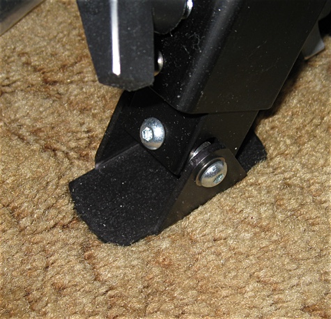 The 5/16"-18 1-1/2" flat hex head bolts reached through the pucks and up into the nylock nuts just the right distance. I over-tightened the nuts a bit. I wanted to make sure that the bolt heads were pulled up into the bottom of the pucks to keep them from scratching something like a wooden floor, and I wanted to make sure everything was tight so the pucks wouldn't spin. How embarassing would THAT be!? I threw a little Super Glue on the bottom of the piece of foam rubber on the bottom of each foot then bolted it all together to help. I was going to use stainless steel bolts, but they were properly 1-1/2" long. These black alloy ones were improperly a bit short, but that worked out overall. If the end of the bolt sticks out of the top of the nut too far it will start running into things that it shouldn't.