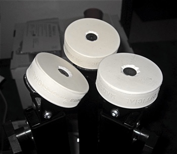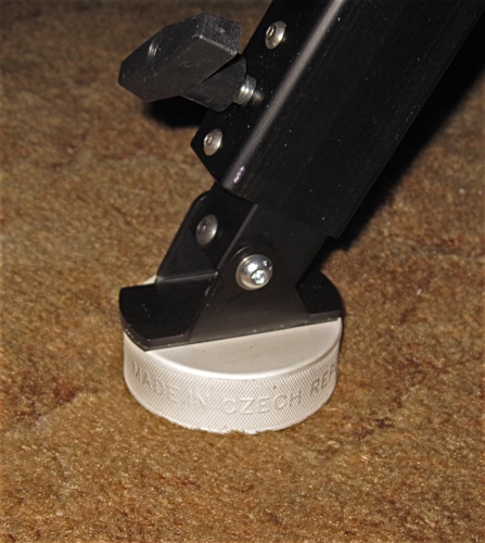 Sigh. Now all of the tripods in the neighborhood are going to want a set. I'm not sure how much vibration damping these hockey pucks will provide -- they're not very springy -- but with the weight of the tripod, the mount and two telescopes they might become springy enough to do some good. However, even the small amount of surface area increase (about double in this case) will help out when the ground is sandy. They'll also help keep the bottom of the legs out of the dirt and moisture. In addition they look cool, don't add to the trip hazard rating of the tripod, and are attached, so I'm not likely to pack up everything and forget them.