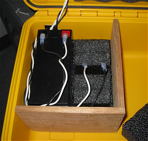 The Wall was fastened to the box with three wood screws coming up through the bottom of the box, and one screw at either end through the walls of the box. Just those few screws made it more secure than I thought it would. The pieces are about 3/8" higher than they should be. When the lid is closed they will push up into the lid foam a bit which will keep connectors and other metal bits outside the battery box from getting inside the battery box while transporting.