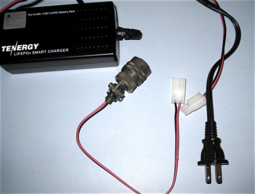 Last thing to do was to convert the battery charger and the power cable for the drive system to the 4-pin connectors. The charger had a plastic connector, so you could connect other things to the charger, but came with a connector and a wire that ended in small alligator clips for connecting to the battery terminals. Snip. The drive's power cord ended in a male cigarette lighter plug. Snip (no medical procedure implied). In the end the meter test and the smoke test indicated I'd managed to keep the polarity of everything straight. The battery and charger combo can handle reversed polarity -- it just won't charge -- but I'm not so sure about the drive system.
