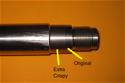 A few days after this outing I met up with Ronnie The Machinist, and over lunch he took off an additional 1/2" or so of material from the shaft and solved the clutch knob problem. You can see in the picture where the outer layer of the shaft had been cut back to originally -- about 1/4" back from the threaded section -- and where it was after Ronnie got through with it. Now there is plenty of space. I can even add a couple more kitchen sinks to the shaft if I need to.