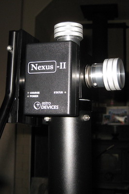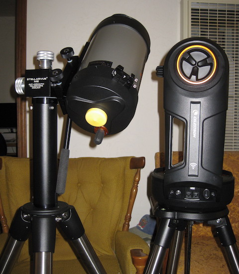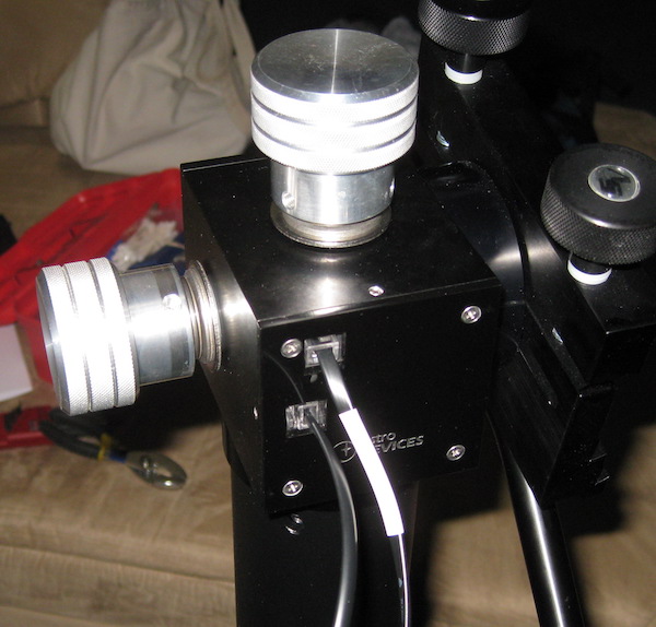 Telescope encoders took an -- almost literally -- quantum leap when they went from optical disks full of stripes to magnetic strips read by a pickup head like in magnetic tape recorders. The Celestron mount on the right has optical encoders. The little square Stellarvue M2 box mount on the left got an upgrade.