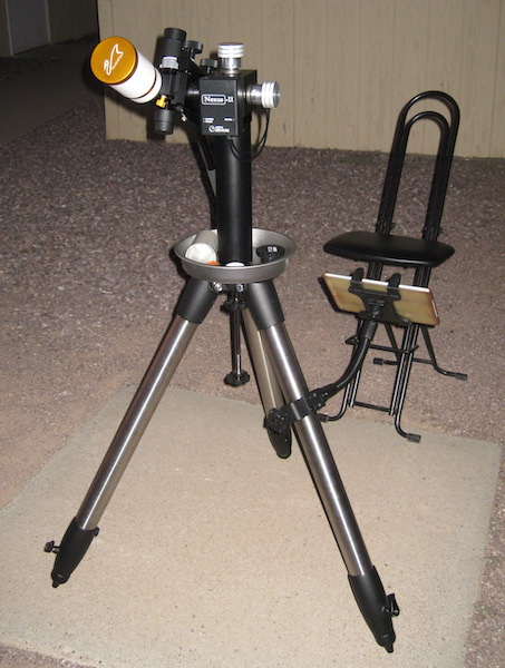 Ready for action. With 311,000 steps the cursor glided across the SkySafari map on my iPad. The $0.88 cake pan from Walmart made a nice tray for stuff. The handle on the M2 mount just misses it. I didn't have the leg spreader installed this outing. Just didn't need it. Now that I look at it a heftier cake pan may work well as a spreader too. Hmmm.